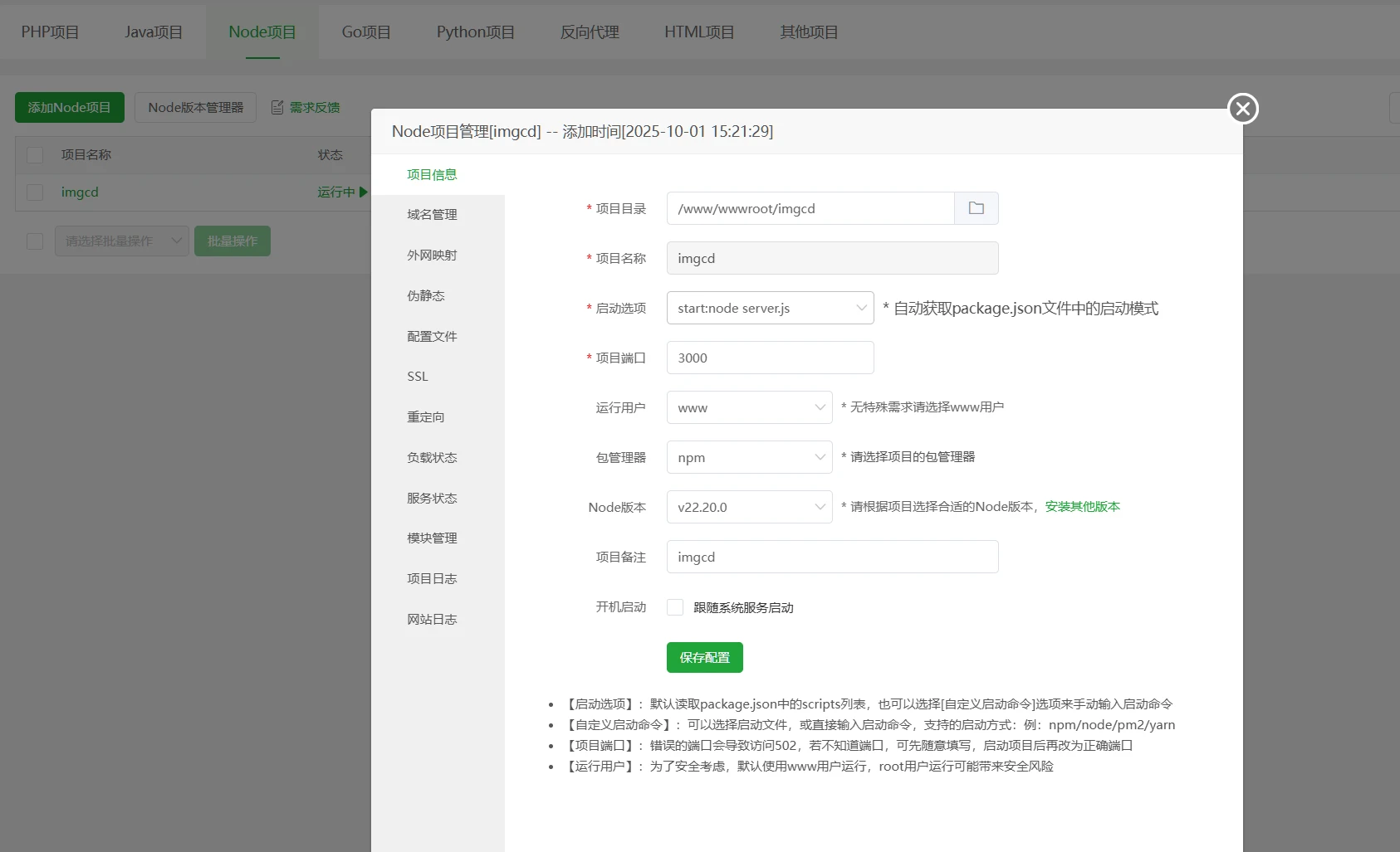 然后开放默认端口 3000,绑定域名,开启外网映射(要 https 的话先找个 php 项目搞个证书再绑定域名到 node 项目里)